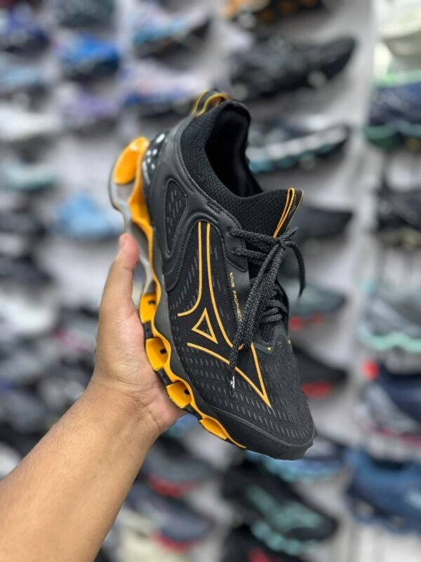 Mizuno Wave Prophecy 14 Preto e Amarelo une qualidade, desempenho e estilo, representando a força da marca Mizuno para quem busca confiança e presença marcante em qualquer ocasião.
